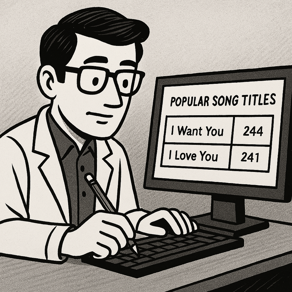 —Mayte, querida, ya te adelanto que «I Want You» es más popular que «I Love You», por lo menos en mi humilde base de datos, aunque solo por sea por tres canciones de diferencia—. Ya puestos a analizar datos, me pareció interesante ver qué otras agrupaciones de palabras se repetían en los títulos de las canciones, ya sabes, por la ciencia. Al final del artículo se pueden consultar todas las tablas. Como bonus, también los he agregado por géneros musicales, más que nada por rellenar. A destacar el género hardcore punk, cuyos títulos denotan ese dramatismo desesperado tan característica del género.